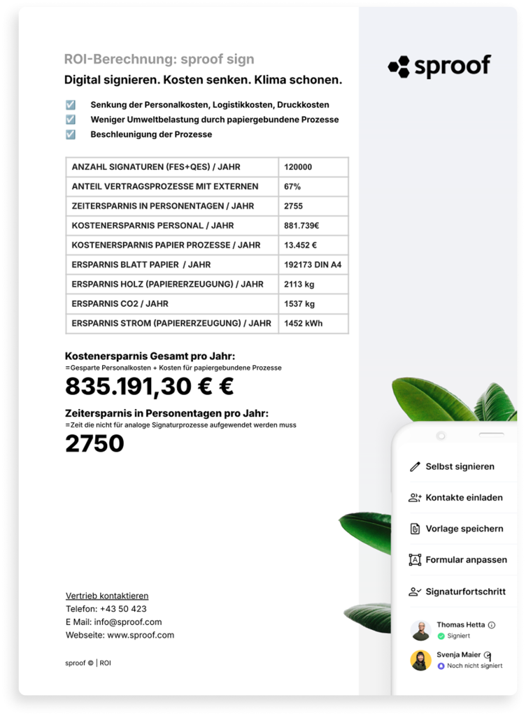 Nachhaltig digital unterschreiben: Berechnen Sie die Einsparungen, die sproof sign Ihrem Unternehmen ermöglicht.